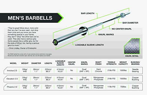 Tensile strength: 216K psi, length: 220cm/86.5″, bar weight: 20kg/44lb, diameter: 28mm/1.1″