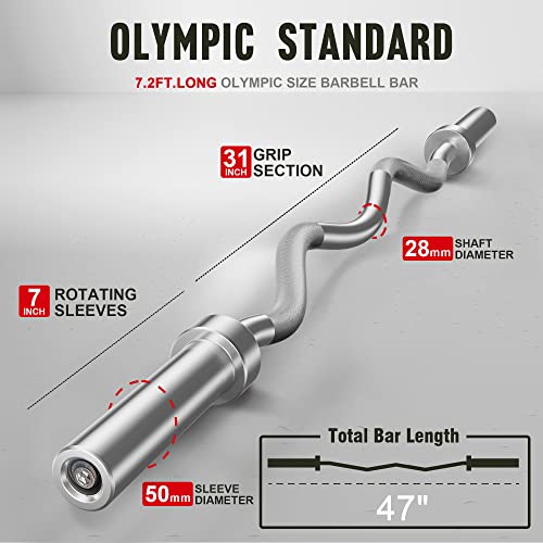 【SPECIFICATIONS】: Length is 47″, self-weight is 22lb, load capacity is 330lb, sleeves diameter is 2″, compatible with all 2 inch Olympic plates, this bar is very versatile.